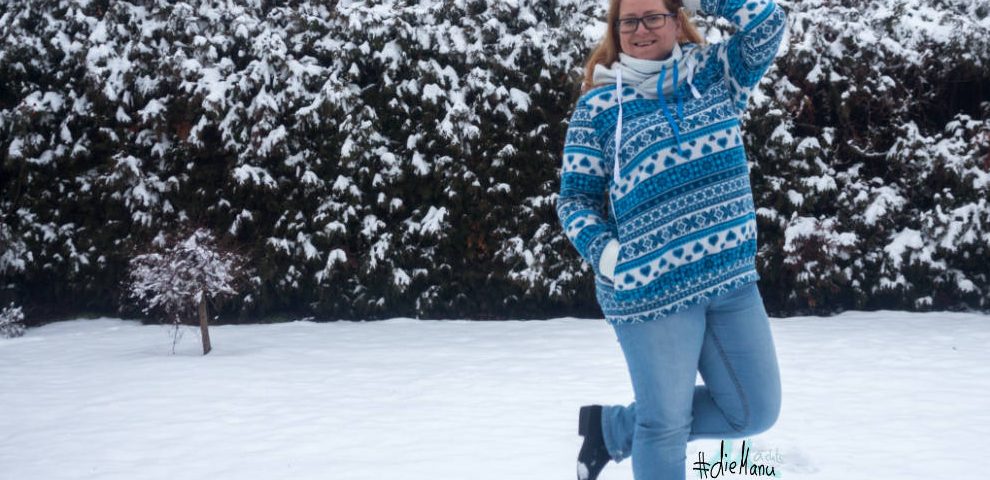 Der tolle Stoff ist übrigens Fleece. Deswegen mag ich ihn im Winter auch so gerne. Außerdem hatte ich extremes Glück weil der gerade in Aktion war damals und ich somit für den blauen nur 5€ pro Meter bezahlt habe. :-O Bei der Größe muss ich leider Lügen, weil ich mir nicht mehr sicher bin. Ich vermute mal, dass ich irgendwas zwischen 50 und 54 genäht habe aufgrund des Brustumfangs.